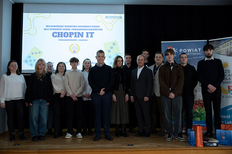 6 lutego w sali widowiskowej w ZS nr 2 w Lubartowie odbyło się podsumowanie IV edycji wojewódzkiego konkursu informatycznego dla uczniów szkół ponadpodstawowych CHOPIN IT, objętego patronatem Starosty Lubartowskiego oraz Wydziału Matematyki i Informatyki Technicznej Politechniki Lubelskiej. Wydarzenie zorganizowali i poprowadzili nauczyciele informatycznych przedmiotów zawodowych.
