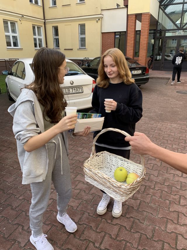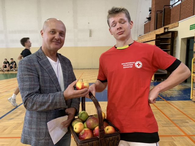 Drugą niezwykłą akcją, która miała miejsce tego dnia, było rozdawanie jabłek. Wszędzie można było zobaczyć wolontariuszy w czerwonych koszulkach. Przemierzali korytarze, dziedziniec, a nawet salę gimnastyczną. W jednej ręce trzymali kosze pełne soczystych jabłek, a w drugiej puszkę do której zbierali dobrowolny datek.