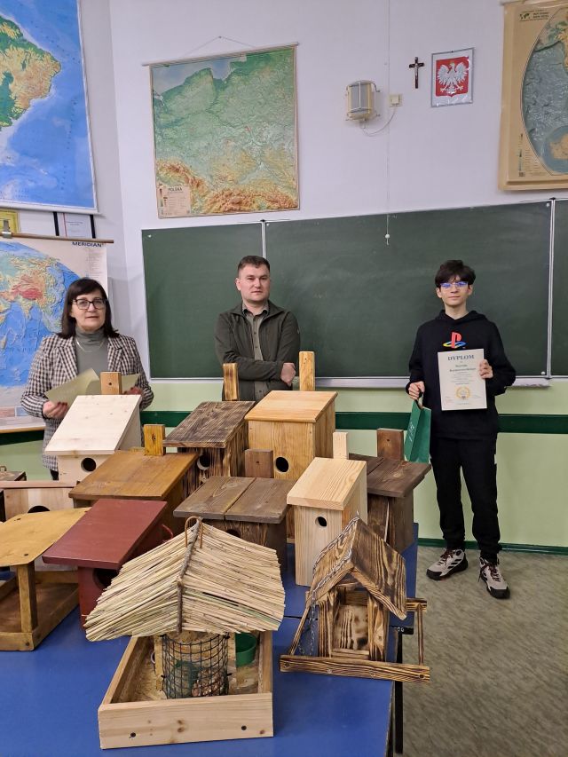 17 grudnia w pracowni geograficznej ZS nr 2 w Lubartowie w obecności Pani dyrektor Janiny Dąbkowskiej, pracownika Nadleśnictwa Lubartów Pana Michała, nauczycielki geografii Moniki Jarosz oraz oczywiście uczestników szkolonego konkursu „Budki dla ptaków” odbyło się jego podsumowanie. Do działania przystąpili uczniowie klas pierwszych liceum, którzy w nagrodę otrzymali ekologiczne upominki ufundowane przez Nadleśnictwo Lubartów, któremu serdecznie dziękujemy. Konkursowe prace zostaną przekazane Nadleśnictwu Lubartów. Wraz z nadejściem wiosny zapewne będą zasiedlone przez ptaki.