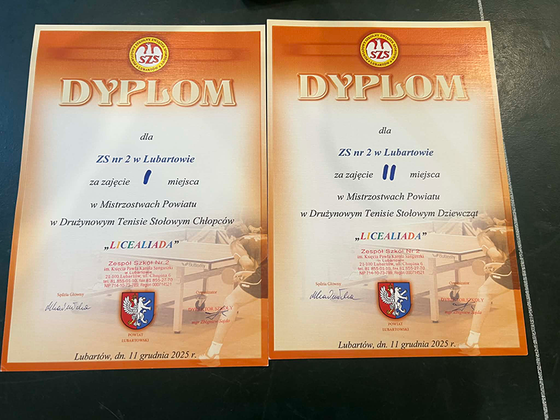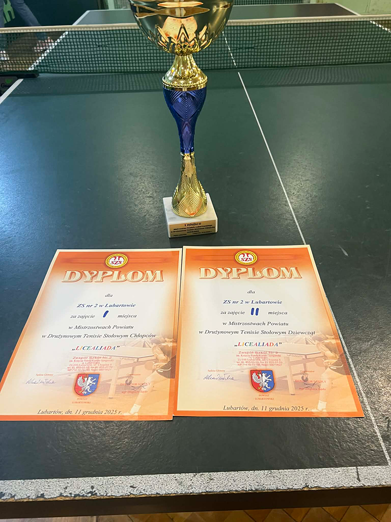 Dnia 11.12.2025r. w pawilonie „Lewartu” odbyły się Mistrzostwa Powiatu Lubartowskiego w Drużynowym Tenisie Stołowym Dziewcząt i Chłopców w ramach Licealiady. Do zawodów zgłosiły się trzy szkoły.