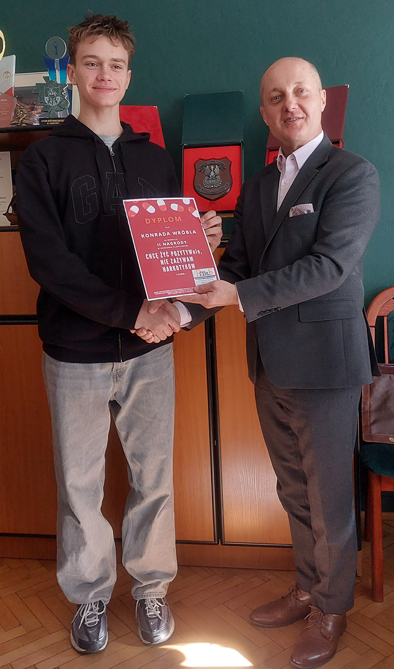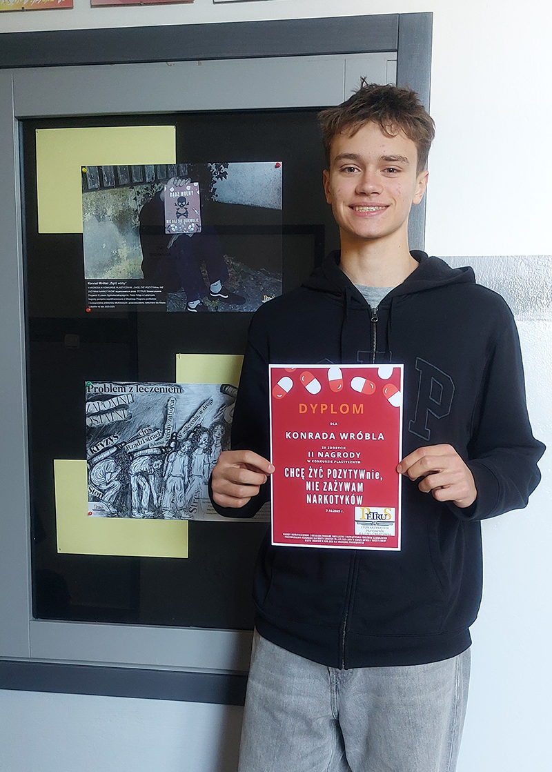 Z radością informujemy, że uczeń naszej szkoły – Konrad Wróbel z klasy III M – zdobył II nagrodę (300 zł) za plakat pt. „Bądź wolny”. Jego praca zachwyciła komisję konkursową czytelnym i sugestywnym przekazem o wolności od uzależnień.
