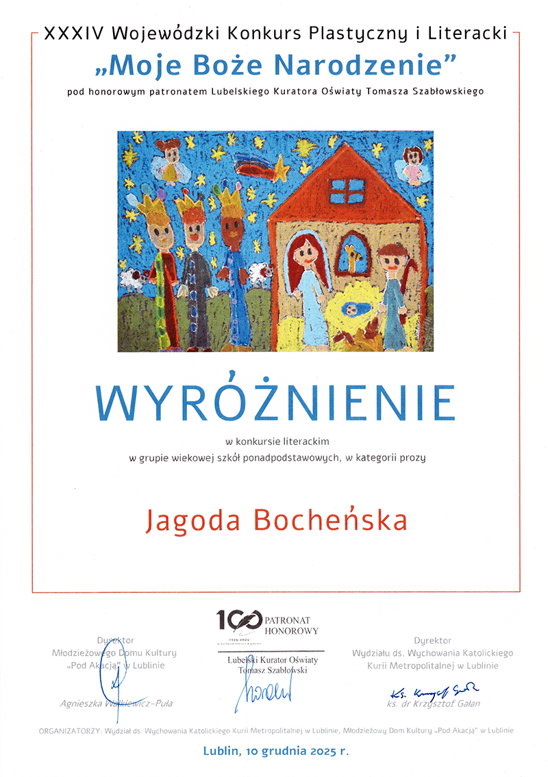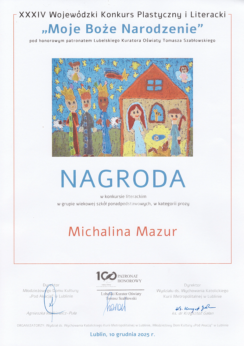W tegorocznym XXXIV Wojewódzkim Konkursie Plastycznym i Literackim, w kategorii szkół ponadpodstawowych, za utwór prozatorski nagrodzone zostały nasze uczennice I LO w Lubartowie: