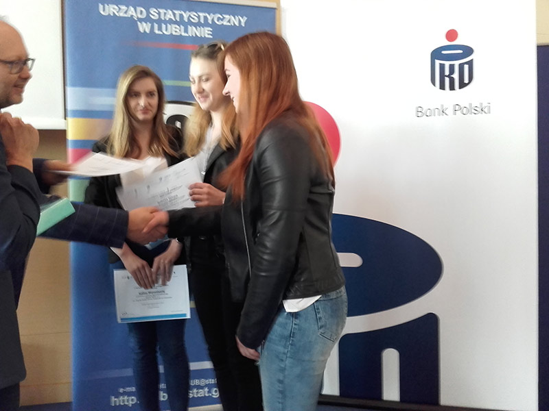 Zespół trzech uczennic: Kaliny, Natalii i Sary z klasy matematyczno-geograficznej zakwalifikował się do kolejnego, finałowego etapu VII Konkursu Statystyczno-Demograficznego, zorganizowanego przez Polskie Towarzystwo Statystyczne, Uniwersytet Marii Curie-Skłodowskiej i Urząd Statystyczny w Lublinie przy wsparciu Narodowego Banku Polskiego. Program konkursu wymagał bardzo dobrego przygotowania z wiedzy i umiejętności ekonomicznych oraz doskonalenia zdolności w zakresie opisywania, analizy i prognozowania zjawisk ekonomicznych, społecznych i gospodarczych z wykorzystaniem metod statystycznych.