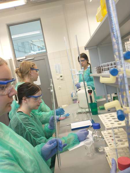 Uczniowie klasy 4B uczestniczyli w warsztatach chemicznych realizowanych na Wydziale Medycznym Katolickiego Uniwersytetu Lubelskiego Jana Pawła II. Przyszli maturzyści wzięli udział w dwóch etapach zajęć, których to motywem przewodnim było miareczkowanie alkacymetryczne. Jest ono umieszczone w wykazie wymagań do egzaminu maturalnego. Miareczkowanie jest metodą stosowaną do ilościowego oznaczania zawartości substancji chemicznej w jej wodnym roztworze. Pierwsze, dwugodzinne zajęcia wzbogaciły wiedzę uczniów o podstawy z zakresu alkalimetrii i acydymetrii. Po treściwym wstępie, uczniowie zapoznani z teoretycznymi podstawami, zostali skierowani do stanowisk, przy których to w dwuosobowych zespołach rozpoczęli realizację działań praktycznych. Uczestnicy warsztatów ubrani w fartuchy laboratoryjne, okulary oraz rękawiczki ochronne przystąpili do przeprowadzania reakcji chemicznych, które polegały na interpretacji zachowania wskaźników kwasowo-zasadowych podczas procesu miareczkowania. Po zakończeniu obserwacji zmian w kolorze roztworów, związanych ze zmianą ich odczynu, uczniowie wykonywali oznaczenia zawartości wybranych substancji w roztworach wodnych. Teoretyczno-praktyczny charakter zrealizowanych warsztatów umożliwił uczniom nabycie wiedzy z zakresu miareczkowania, a także umiejętności analizowania wyników i rozwiązywania zadań w oparciu o nie. Zajęcia, w których z ogromną fascynacją wzięli udział przyszli maturzyści, z pewnością przyczynią się do owocnego rozwiązania zadań w oparciu o uzyskaną wiedzę, a co się z tym wiąże- satysfakcjonującego wyniku z egzaminu maturalnego.