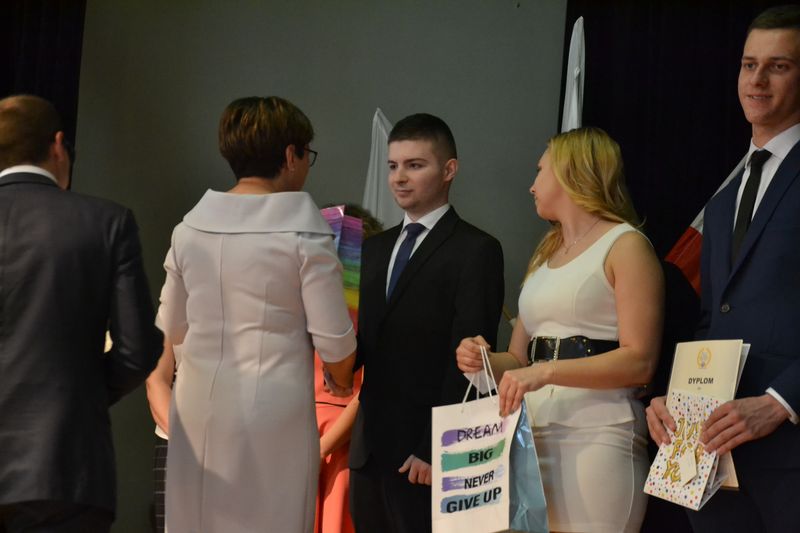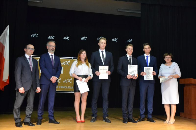 Uroczystość uświetnili swoją obecnością: Członek Zarządu Powiatu - pan Radosław Guz, Sekretarz Powiatu - pan Michał Rola oraz zaproszeni Rodzice. Dumą napawa fakt, że tak wielu uczniów naszej szkoły otrzymało nagrody za doskonałe wyniki w nauce i wspaniałe osiągnięcia sportowe, a także pracę w radiowęźle, Samorządzie Uczniowskim, Szkolnym Klubie Wolontariusza oraz działalność artystyczną i reprezentowanie szkoły w poczcie sztandarowym. Pani dyrektor Anna Wójtowicz i pan Radosław Guz skierowali wiele ciepłych słów do naszych maturzystów. W imieniu wychowawców wzruszające przemówienie wygłosił pan Sławomir Tomasiewicz, a przedstawiciele społeczności uczniowskiej pożegnali swych starszych kolegów życzeniami i krótką częścią artystyczną. Tym razem swoje muzyczne zdolności zaprezentowały: Martyna Tomasiak oraz Aleksandra Mazur.