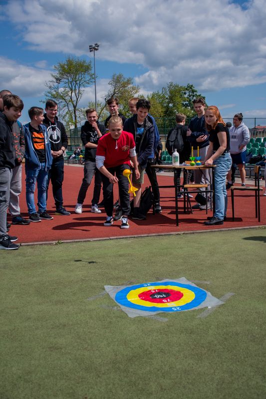 Na boisku szkolnym umieszczono sześć stanowisk z zadaniami. Klasy przychodzące przy zachowaniu reżimu sanitarnego na poszczególnych lekcjach miały za zadanie zdobyć punkty w kilku super trudnych konkurencjach: