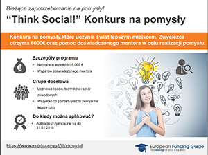 Czy masz ciekawy pomysł jak zmienić świat, aby był lepszym miejscem? Jeśli tak, to weź udział w programie „Think Social!”. Uczniowie mogą uczestniczyć w programie poprzez wysłanie krótkiego filmu lub tekstu opisującego dany pomysł. Jako zwycięzca otrzymasz 6.000 € oraz osobistego mentora, który pomoże w realizacji twojego pomysłu.