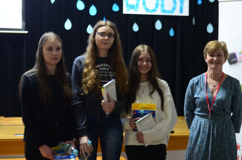 Dziewczęta z klasy II A pod opieką nauczyciela geografii, Pani Moniki Jarosz przygotowały prezentację na temat wody. Jak wszyscy wiemy, jest ona niezbędna do życia, stanowi 70% naszego ciała i 71% powierzchni świata. Woda jest również jedną z form energii odnawialnej. Na pokaz prezentacji zaprosiliśmy klasy o rozszerzeniu geograficznym. Delegacje klas zaproszonych wzięły udział w quizie na temat wody. Był też konkurs plastyczno – ekologiczny z nagrodami. Wszyscy biorący udział w konkursach zostali nagrodzeni drobnymi produktami sponsorowanymi przez lokalną firmę Stella Pack. Natomiast społeczność całej szkoły mogła degustować wodę mineralną od kolejnego sponsora – Cisowiankę, która była rozdawana przez uczniów z klasy II G. Dodatkowo każda osoba dostawała karteczkę z informacją na temat wody. Ci, którzy chcieli się wykazać znajomością wiedzy o wodzie, mogli spróbować swoich sił i wylosować pytanie. Po udzieleniu dobrej odpowiedzi otrzymywali butelkę dobrej wody mineralnej.