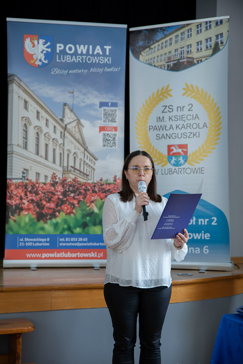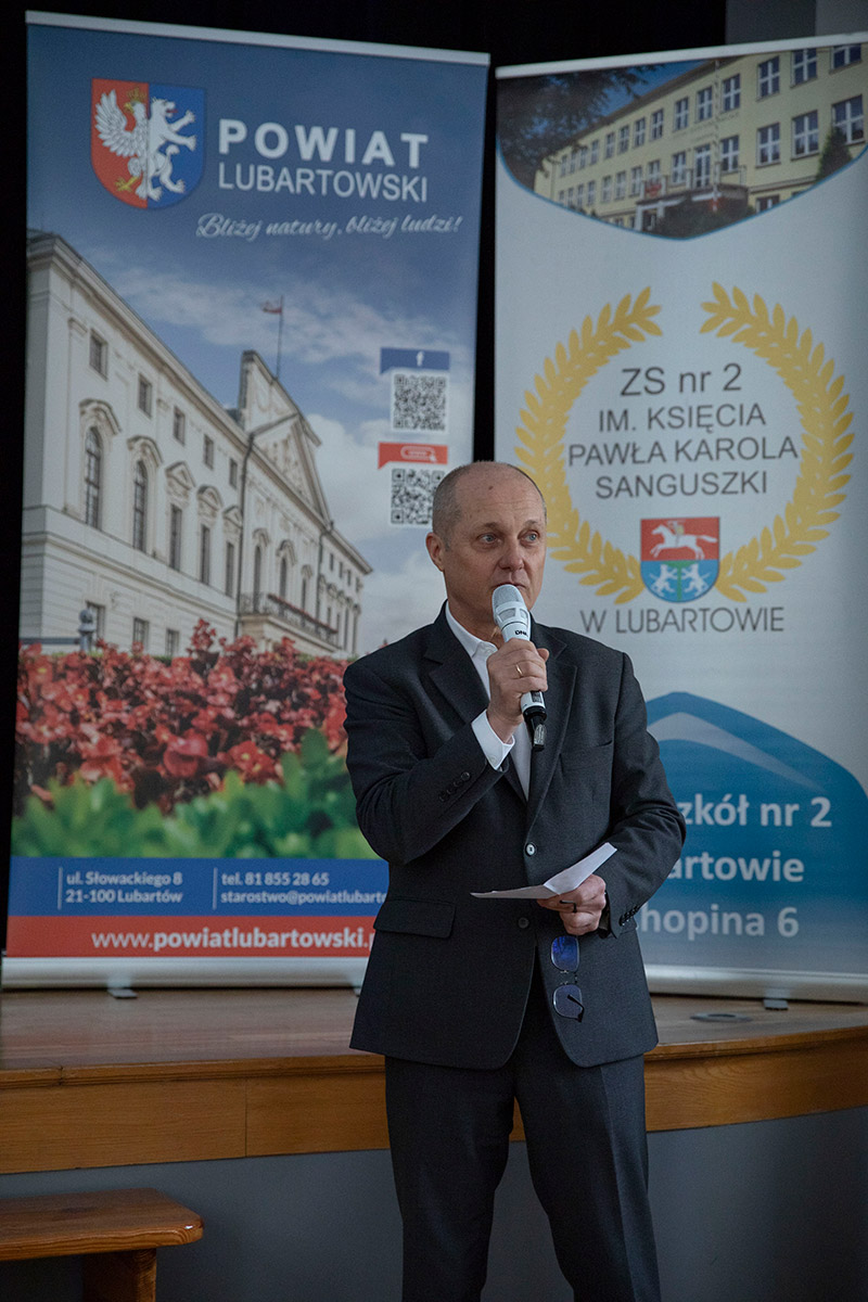 Dyrektor szkoły, p. Zbigniew Sajda, przywitał zaproszonych gości, tj.: Kierownika Wydziału Oświaty i Sportu Starostwa Powiatowego w Lubartowie, p. Aleksandrę Kociszewską, Asystentkę w Katedrze Informatyki Technicznej Politechniki Lubelskiej, p. mgr inż. Magdalenę Wlazło, a także uczestników konkursu z RCEZ w Biłgoraju, ZS nr 1 w Hrubieszowie oraz ZS nr 2 w Lubartowie wraz z opiekunami.