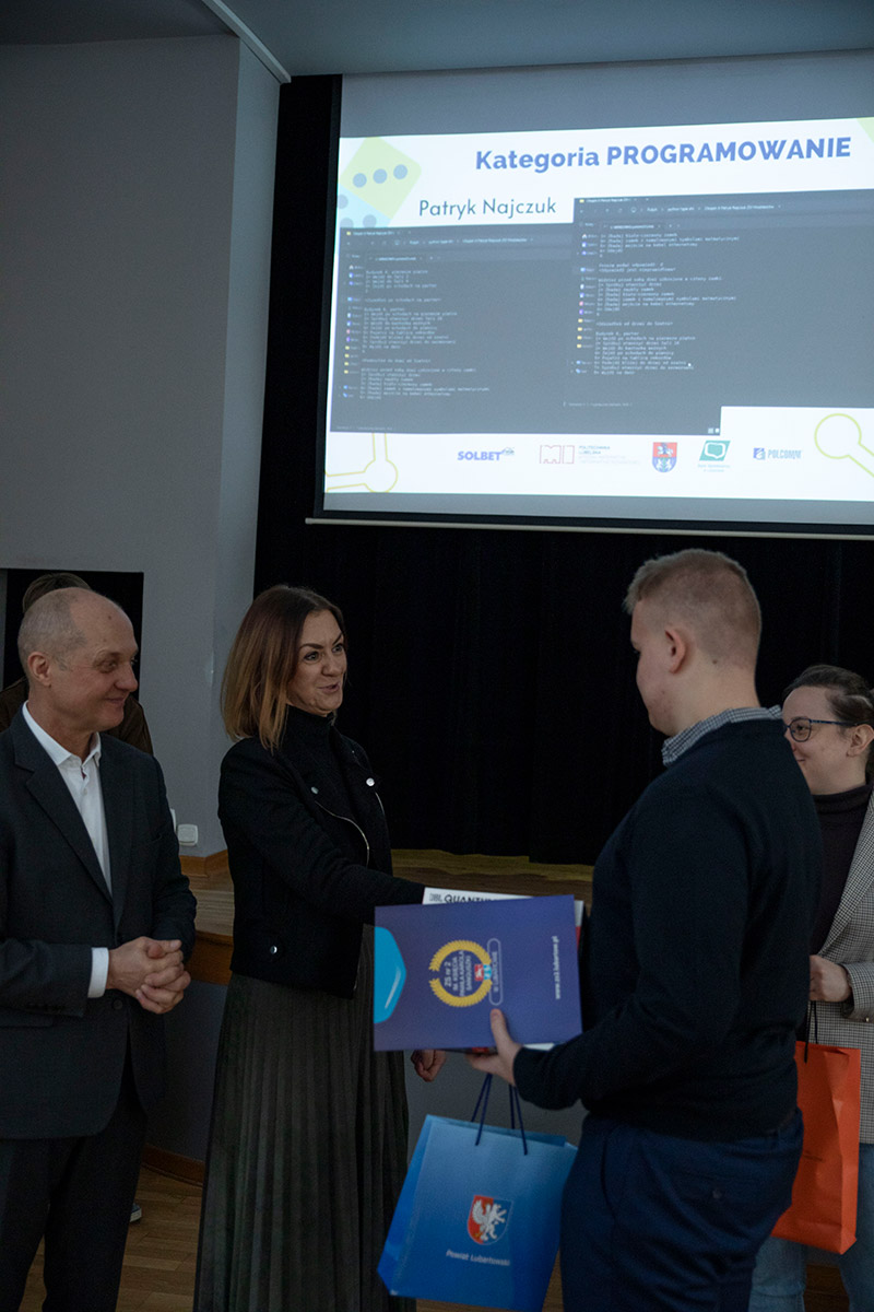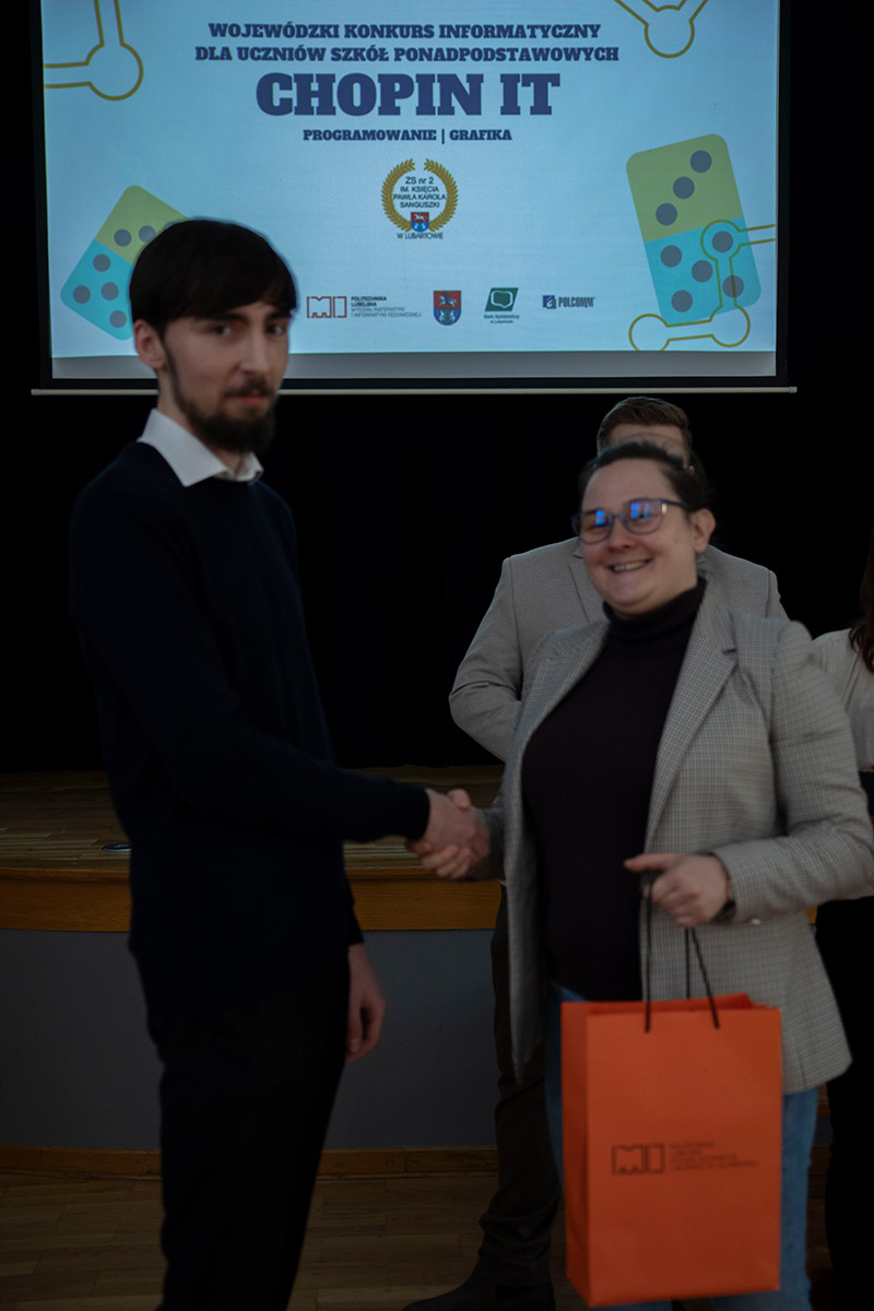 6 lutego w sali widowiskowej w ZS nr 2 w Lubartowie odbyło się podsumowanie IV edycji wojewódzkiego konkursu informatycznego dla uczniów szkół ponadpodstawowych CHOPIN IT, objętego patronatem Starosty Lubartowskiego oraz Wydziału Matematyki i Informatyki Technicznej Politechniki Lubelskiej. Wydarzenie zorganizowali i poprowadzili nauczyciele informatycznych przedmiotów zawodowych.