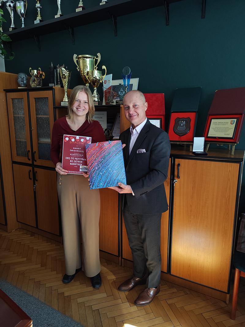 Również Hanna Świderska z klasy III P została wyróżniona za plakat pt. „W życiu dobre rozdanie to używek unikanie”. Jej praca zwróciła uwagę pomysłową grą słów i oryginalną formą artystyczną.
