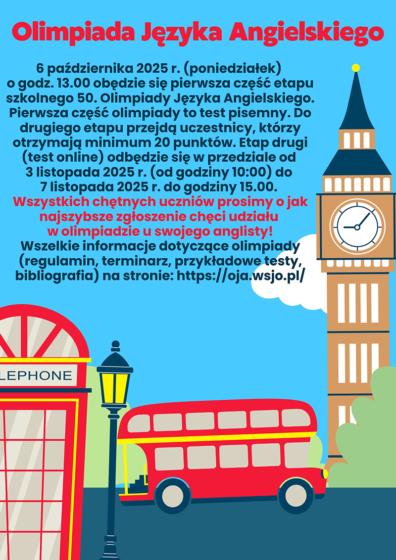 6 października (poniedziałek) o godz. 13:00 odbędzie się pierwsza część etapu szkolnego 50-tej Olimpiady Języka Angielskiego. Jest to część pisemna.