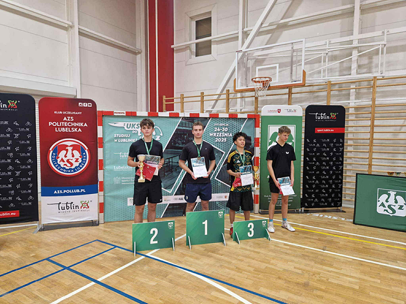 29.09.2025r. w hali sportowej Politechniki Lubelskiej odbyła się XVI edycja turnieju tenisa stołowego ,,Z UKS- u do AZS-u. Studiuj w Lublinie”. Do rywalizacji zgłosili się najlepsi zawodnicy w województwa lubelskiego. Pierwsze miejsce w województwie w kategorii chłopców zajął Wiktor Kozioł z kl. IV S, VII miejsce zajął Grzegorz Marzęda z kl. II M (op. Beata Sajda). Wiktor Kozioł będzie reprezentował Województwo Lubelskie podczas Mistrzostw Polski, które rozegrane będą w grudniu w Warszawie.