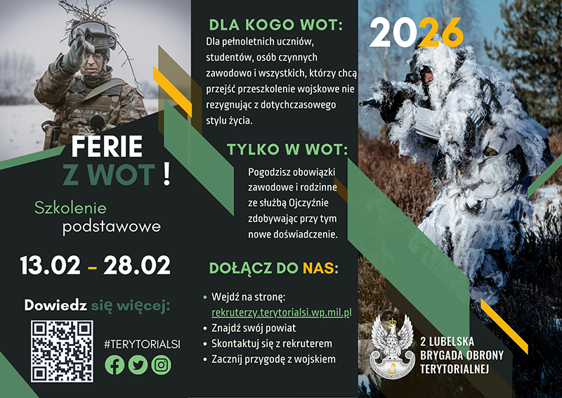 Jesteś osobą pełnoletnią i chcesz zrobić coś konkretnego, sprawdzić siebie i zdobyć realne umiejętności, możesz wziąć udział w projekcie „Ferie z WOT 2026”, organizowanym przez @2 Lubelska Brygada Obrony Terytorialnej.