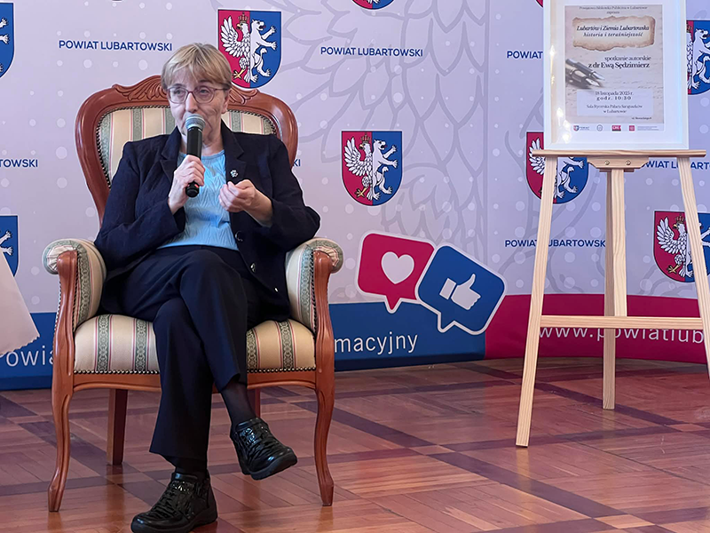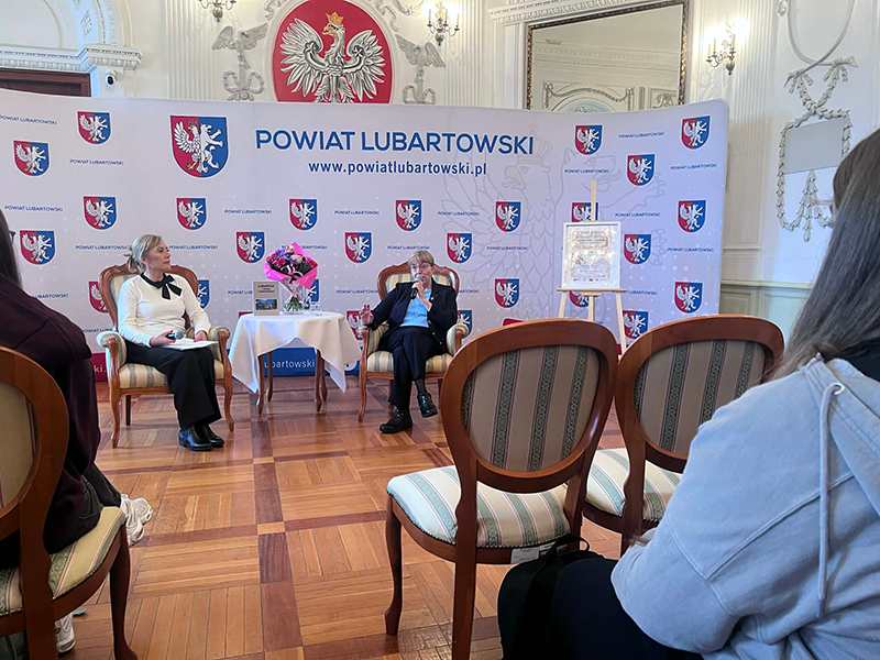 Promocja najnowszego tomu wydawnictwa „Lubartów i Ziemia Lubartowska” była okazją do spotkania uczniów klasy humanistyczno-prawniczej z I LO w Lubartowie z dr. Ewą Sędzimierz historykiem, regionalistą i Prezesem Lubartowskiego Towarzystwa Regionalnego. W murach Sali Rycerskiej Pałacu Sanguszków dr Ewa Sędzimierz, przybliżyła uczniom historię stowarzyszenia oraz opisała szeroki zakres jego działalności. Głównym punktem wydarzenia była promocja najnowszej książki z cyklu „Lubartów i Ziemia Lubartowska”, która po raz kolejny dała możliwość pogłębiania wiedzy na temat historii miasta. Autorzy przybliżają w niej czytelnikom ważne wydarzenia i osoby tworzące historię i kulturę Ziemi Lubartowskiej. Dla młodzieży była to wyjątkowa okazja do poznania, z ust osoby, która jak mało kto zna historie naszej małej ojczyzny, kulisów powstawania tej publikacji i ciekawostek związanych z opisywanym wydarzeniami czy postaciami. Warto również wspomnieć, że w bibliotece szkoły „na Chopina” znajduje się wiele pozycji opisujących historię Lubartowa, co pomaga uczniom poznać losy regionu.
