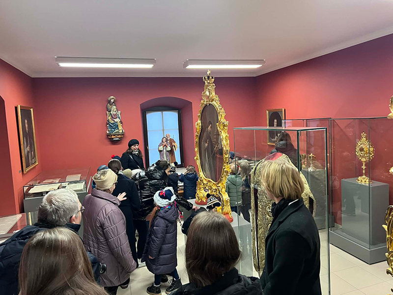 Następnie Pani dr. Ewa Sędzimierz oprowadziła obecnych po Muzeum Parafialnym, opowiadając o wielu ciekawych eksponatach oraz przedstawiając oryginalne dokumenty czy stroje sprzed kilkuset lat!