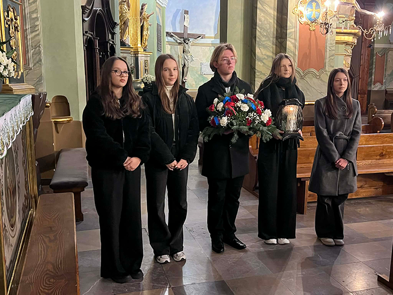 O swoim patronie mieli szczęście usłyszeć uczniowie klasy 2H - Agata Polichańczuk, Maja Jaszcz, Magda Goławska, Matylda Ciesielska i Dominik Cieniuch - z delegacji zespołu szkół nr. 2 w Lubartowie, którzy pod opieką Pana dyrektora, Zbigniewa Sajdy i Pani pedagog Agnieszki Semeniuk na zakończenie tej części wydarzenia z honorem złożyli kwiaty i znicz przed nagrobkiem książąt Sanguszków. Znajdujesię on we wnęce, po prawej stronie ołtarza, gdzie spoczywają serca księcia Pawła Karola Sanguszki, jego żony i syna. Kwiaty złożyła też delegacja Urzędu Miasta, a wszystkiemu przyglądali się uczniowie Lubartowskich przedszkoli i szkół z czerwono-niebieskimi flagami miasta w dłoniach.